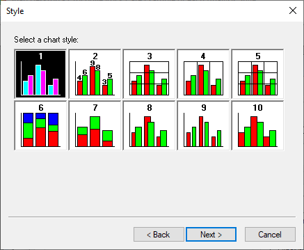 1. Click Next to go to the Style page. This lets you set chart display options such as series labels, stacking and bar gap. The options shown will be different depending on the type of chart you are designing.