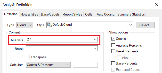 2. Click Analysis Cloud  AnalysisCloudIcon.png  on the Snap XMP Desktop toolbar. This opens the Analysis Definition window to create a word cloud.