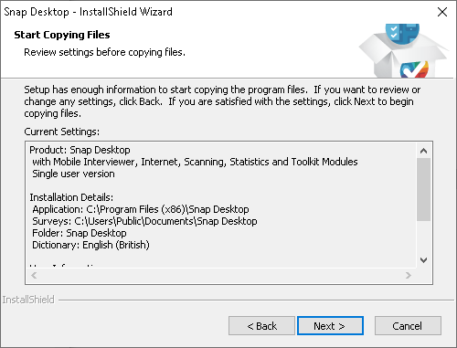 - The installation wizard completes your user name and company name based on the settings stored in your machine. You may edit these if required, but this does not change the settings held on your machine and Snap Surveys does not use the information.