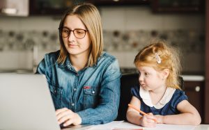 Woman and child working and looking at laptop