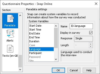When you have multiple language editions of a questionnaire, the variable ID.language is created automatically. This is preloaded with the language value when you publish the questionnaire, allowing you to do analysis by language.