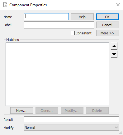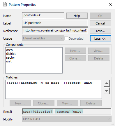 - On the Pattern Properties dialog you will see that you now have a list of Components but no overall Match for the pattern. Select New under the Matches part of the dialog and the Match Pattern dialog will display again