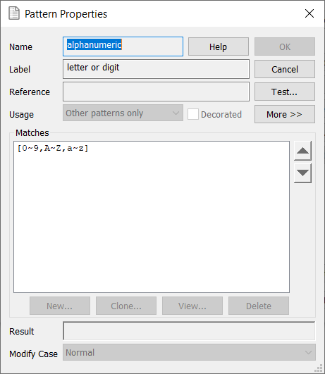 | Result | The text or component result after applying the pattern. If this is empty, any component results will be used. If there are no component results, no transformation will take place. Right-click in field to select a component name to use as the result. |