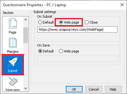 - Type the full web address https://www.snapsurveys.com/{WebPage} into the text box. The variable name must be enclosed in curly brackets. When ‘Research services’ is selected the web page shown after the participant submits their response will be https://www.snapsurveys.com/services.