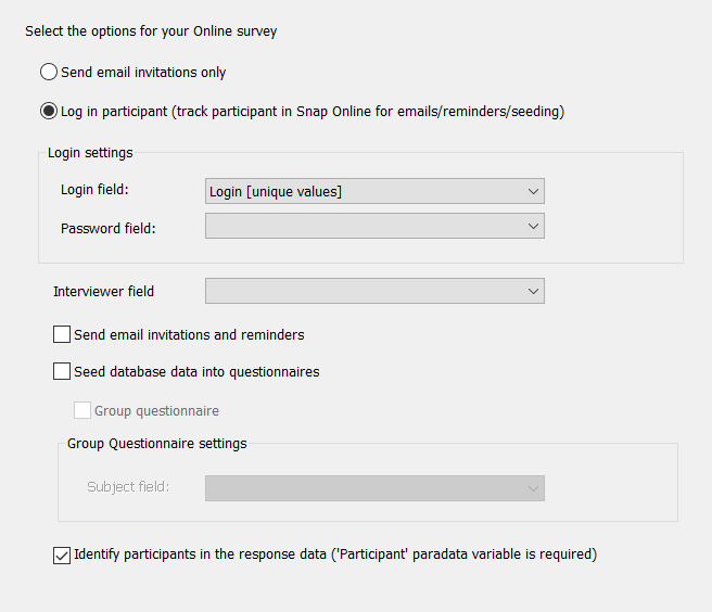 Select the Log in participants option to provide the option to track and manage participants in Snap XMP Online. The participant data must contain a field containing unique values to use as the login. You have the option to require a password, send email invitations, seed the questionnaire as well as use group questionnaires.