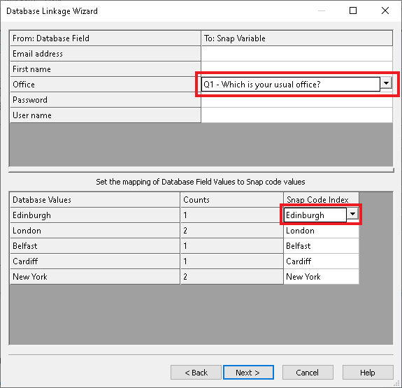 - Single and multiple response questions in Snap XMP Desktop have a code for each possible answer. You can seed data directly into one or more codes. Select the code that you wish to seed for a given value of the database field. The example shows different offices in the database that are seeded into the multiple response question Office.