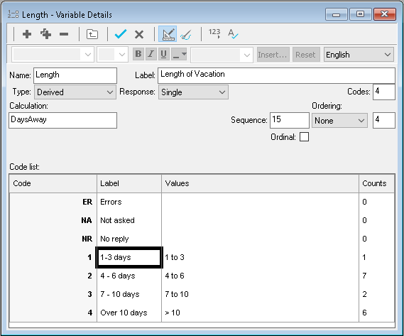 - In the Code list, click the Label field for Code 1 and enter 1 to 3 days. Press Tab on the keyboard, to move to the Values column. In this column Snap needs to know what numbers are to be displayed in this answer, enter 1 to 3. Follow the same procedure to create categories for 4 to 6 days, 7 to 10 days and over 10 days.