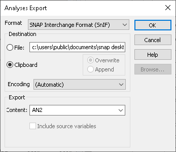 on the Snap XMP Desktop toolbar. This opens the Analyses window. - Select the menu option File | Export to display the Analysis Export dialog.