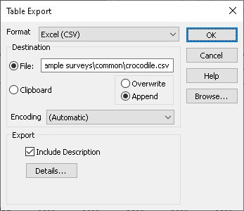 - Specify the Format for the exported analysis. This will depend on the requirements of the package that the analysis is destined for. Comma separated and Tab separated are only suitable for table and list export.