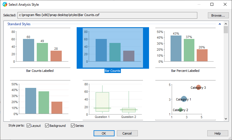When creating an analysis chart, you need to select the type or style of the chart. Snap XMP provides a large number of pre-defined chart styles. These styles define the layout and colors used to display the chart. Some styles define only the color scheme which is useful when you need a specific set of colors, such as for your organisation’s branding. The pre-defined styles can be edited using the Chart Designer.