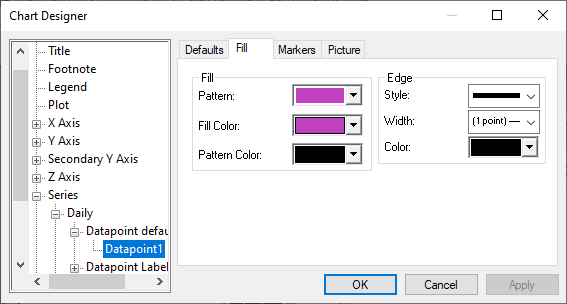 - Here you can change the Pattern, Fill Color and Pattern Color. The Edge style can also be changed. Click Apply to see your changes on the chart.