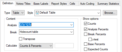 - Add the semantic scale grid variables to the Analysis field. You can add the whole set in the form Q7.a to Q7.c, or you can add individual questions separated by commas.