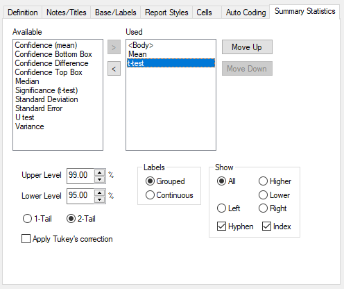 Although the t-test is a reliable statistical method that allows you to analyse any major categories of respondents and see if the way they are responding is significantly different, when comparing more than two categories of data it can produce some unexpected results. Therefore when doing analysis across more than two categories of data it is advisable to apply Tukey’s Correction, which is available in the Summary statistics tab of the Analysis Definition dialog.