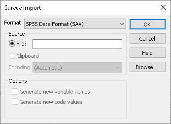- Specify the Format as triple-s Format (SSS). Specify the Source as File. Clicking Browse allows you to view and select the file containing the survey to be imported.
