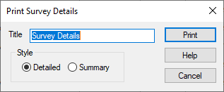 - Select Detailed to print a report on the currently selected survey. This will include dates of creation, last update and last used, together with number of cases, verified cases, variables, weights and reports. (The same information displayed in the Survey Details dialog.)