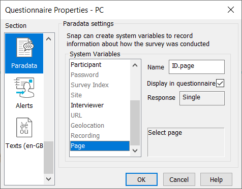 - In System Variables, select Page then select Display in questionnaire. This adds a question at the start of the questionnaire. Click OK to save the settings.