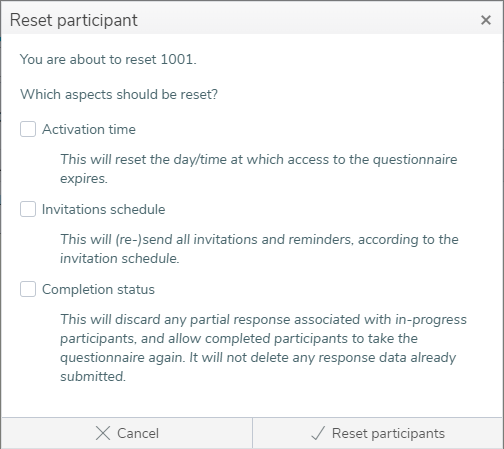 This resets the time scheduled for the invitations and reminders to be sent out. The first invitation is scheduled to the time that the participant is reset by clicking the Reset participants button. The following reminders are rescheduled according to the Days to wait before sending. This is only shown when invitations are used.