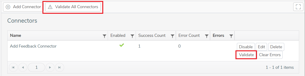 - To validate an individual connector, click the Validate button on the Connector row in the list of connectors.