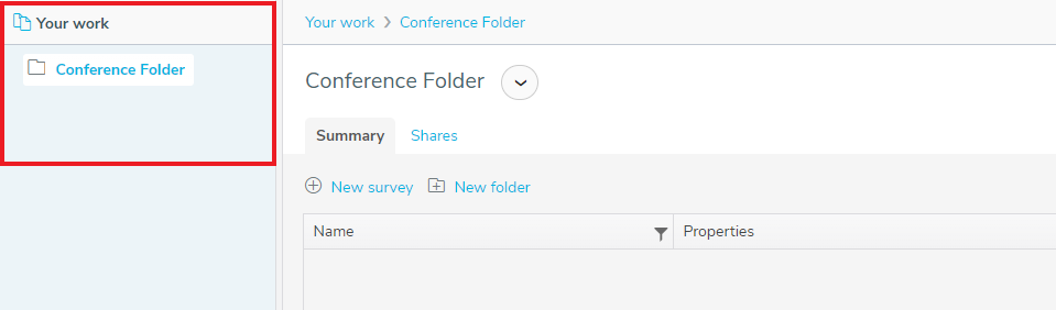 Folders help to organise surveys and other subfolders in Your work. They keep related surveys together in one place, which can help group surveys together for sharing with other users.