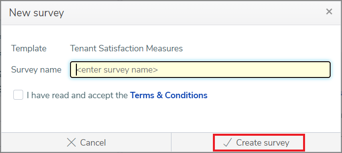- Enter the survey name; select the checkbox to confirm that you have read and accept the terms and conditions then click Create survey.